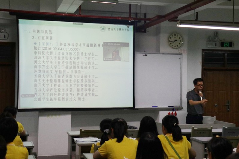 卢远书记以生动的语言与真实的案例一步一步引领新生们更加深入地了解学术规范的重要性。他指出学界中存在的学术不端及科研不端行为,并以自己的所见所闻为例,提醒同学们不要存有侥幸心理违反学术道德与规范,也要注意保护好自己的知识产权。