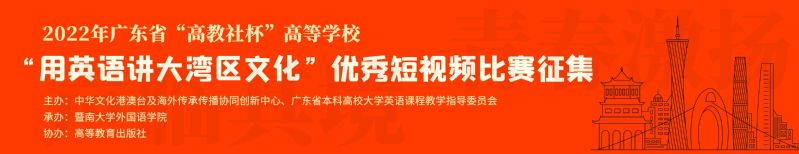 首届广东省“高教社杯”高等学校“用英语讲大湾区文化”优秀短视频可选择围绕大湾区内广东非遗传承人、广府文化,潮汕文化、客家文化、港澳文化、民俗、建筑、粤剧、潮剧、广绣、金漆木雕等文化因素,充分发挥创新精神,用英语讲好湾区故事。
