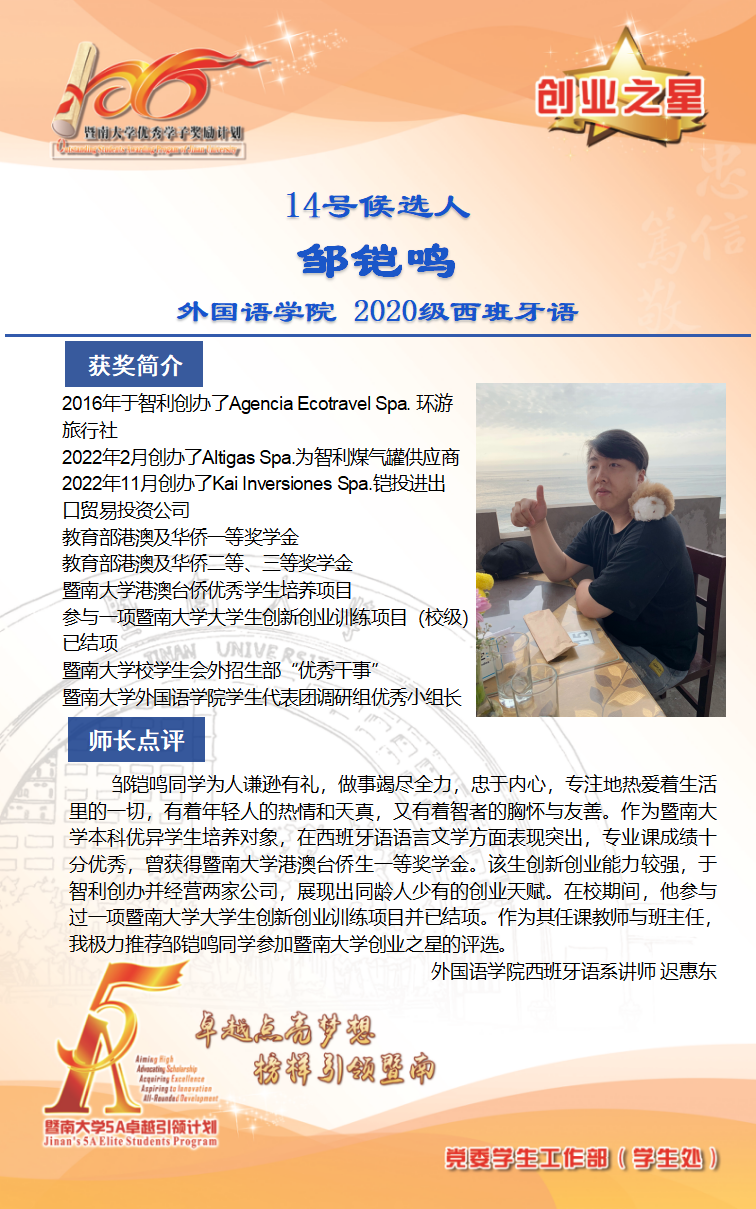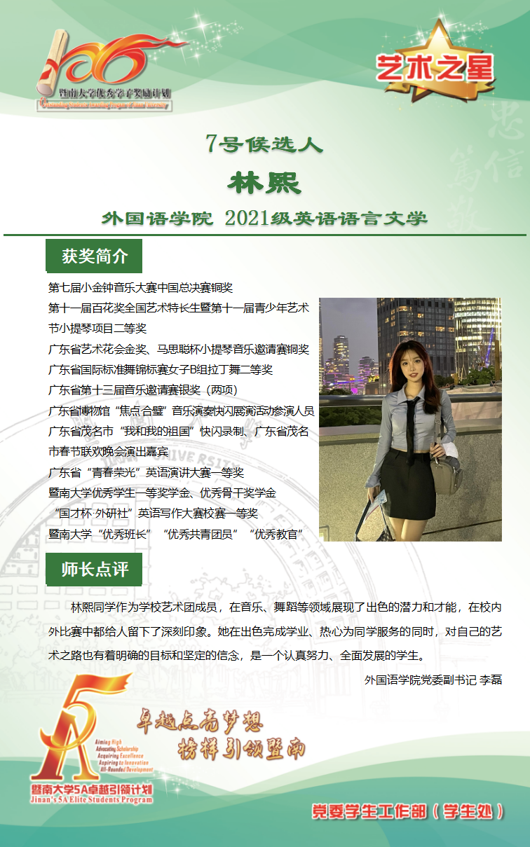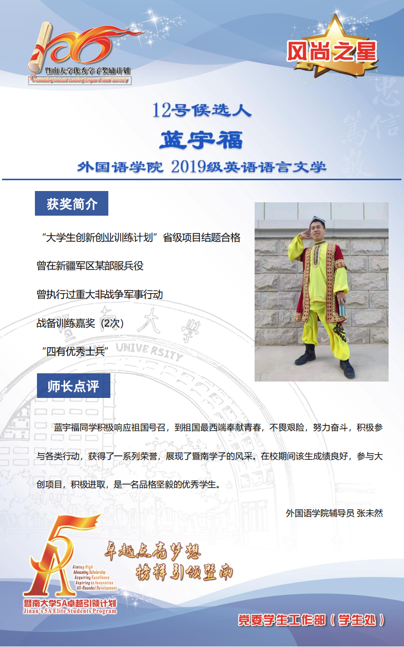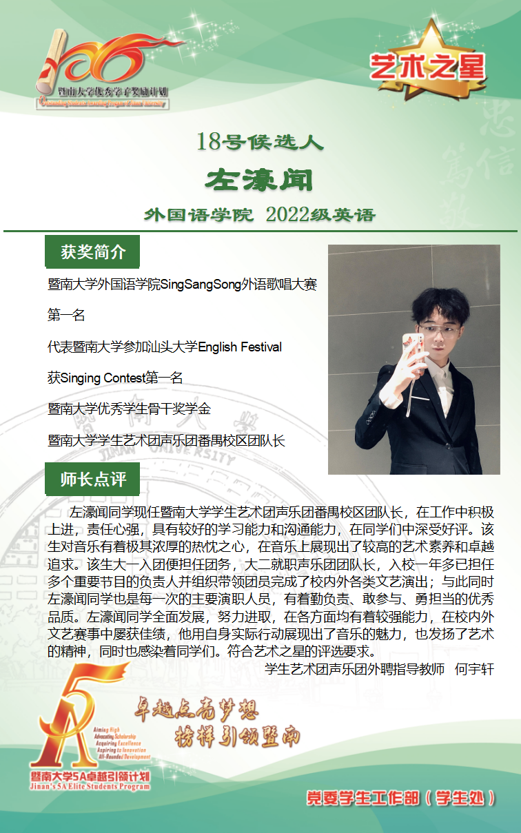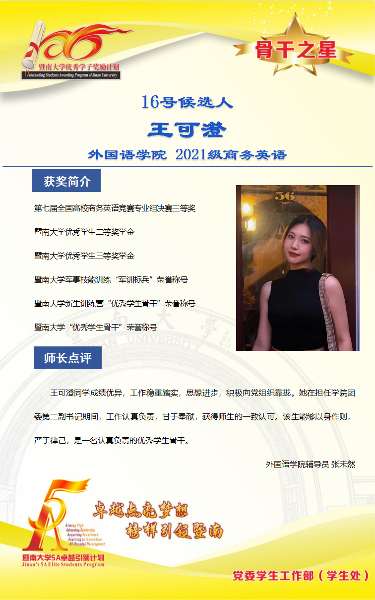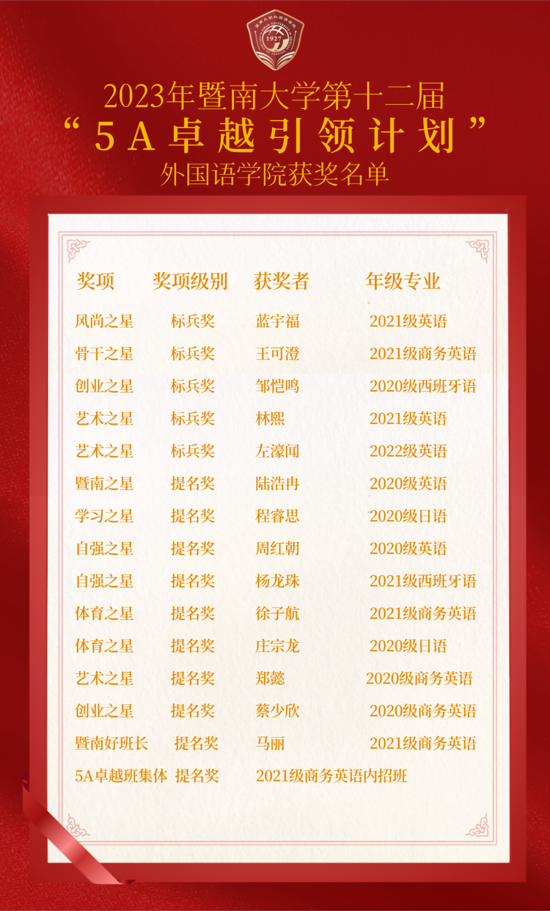 卓越点亮梦想,榜样引领暨南。beat365亚洲体育官方网站“5A卓越引领计划”集培养、评选、表彰、分享、引领五位一体的学风建设闭环机制,注重为优秀学子提供良好的展示和分享交流平台,发挥暨南园的榜样力量。
