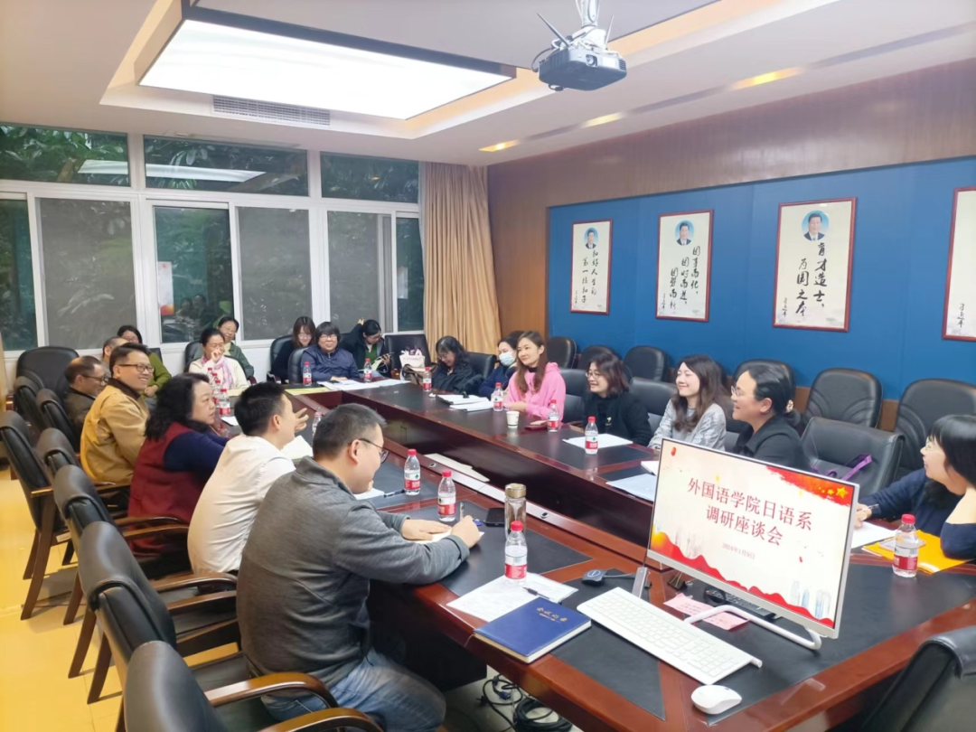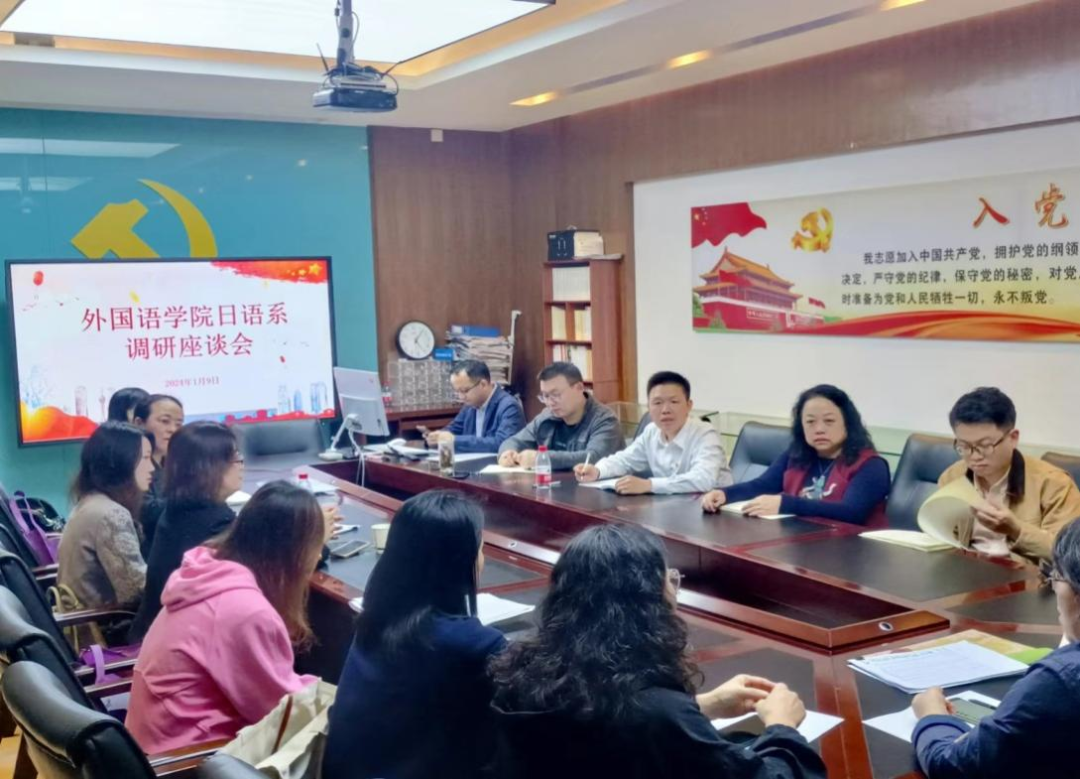 1月9日下午,beat365亚洲体育官方网站日语系调研座谈会在第二文科楼207会议室召开,院长蒲若茜、党委书记陈文举、副院长朱红强、办公室主任陈俏君及18位日语系教师参会。