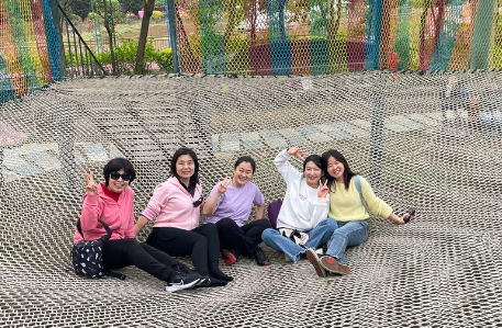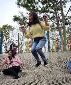 在景区的丛林魔网游戏区,教工们和小朋友们纷纷上去体验,笑声和欢呼声此起彼伏,大家在弹跳中释放压力,找回了久违的童真与快乐。
