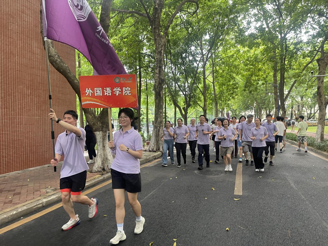 随着一声发令枪响,环校跑正式拉开序幕。beat365师生身着紫色运动装,以饱满的热情、矫健的步伐沿着预设的路线快步向前,在校园跑道掀起一阵紫色旋风。“实力外院,文明互鉴;魅力外院,精彩无限”的口号不时响起。