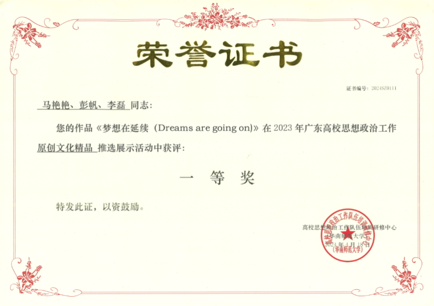 近日,高校思想政治工作队伍培训研修中心(华南师范大学)公布了2023年广东高校思想政治工作优秀作品评选活动奖项。由beat365大学英语教学部马艳艳博士、彭帆副教授、学院党委副书记李磊合作制作的视频《梦想在延续》(Dreams are going on)获得广东高校思想政治工作原创文化精品一等奖。