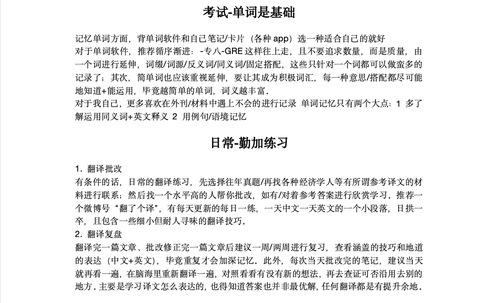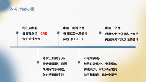 第三位进行分享的是罗宇同学,他从备考资料、备考过程、考前和考试注意事项四个方面进行了分享。首先是备考资料,他给我们推荐了官方教材、政府工作报告、《十二天突破英汉翻译》、公众号“XXLIN987”等作为平时翻译素材的来源,还分享了他的背单词利器“不背单词”app和热词积累渠道“小红书”app。其次是备考过程,针对单词板块,他建议我们最好背到“GRE”单词;针对翻译思路和技巧学习,英汉翻译他推荐我们学习武峰老师的课程,汉英翻译他推荐我们学习朱湘军老师的课程;针对定期实践,他推荐我们每天最好完成一篇翻译和复盘;此外,他还会以课堂练习和翻译竞赛来进行辅助练习。针对备考时间,他是这样规划的(如下图)。接下来是考前注意事项,他强推购买或租借《陆谷孙英汉大词典》及《新世纪汉英大词典》,并建议我们提前熟悉字典结构,以免在考场上耽误时间;由于考试采取机考的方式进行,他还建议我们平时就用电脑做翻译实践,练习打字速度。最后是考试注意事项,他提醒我们要好好休息保持清醒,进入考场后提前熟悉设备,把翻译全部完成之后再去查生词以便节约时间。关于译文质量,他认为“完整性>准确性>流畅性”,因此先把译文完成是重中之重,一定要注意考试过程中的时间分配。