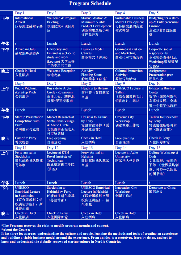 北欧创新与创业管理项目的核心在于采用科学的方法,引导学生深入学习从商业构思的产生到研究、开发到商业化的全过程。课程分为两部分,第部分为课程学习,可选课程丰富,包含数字营销、企业创新管理、融资和风险管理、国际战略以及企业社会责任等。第二部分为世界名校和企业参访。同学们在导师的指导下,通过个人演讲,团队协作,模拟创投会的形式,理论与实践结合,构建清晰的体系。项目在瑞典、芬兰和爱沙尼亚三个国家三所高校进行。