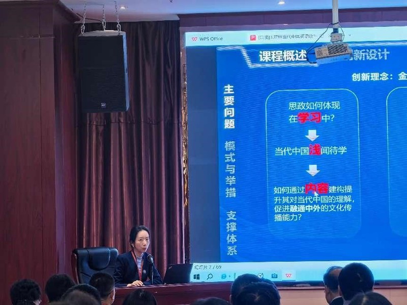 beat365青年教师雍茜副教授在会上做了主旨发言。她以“三分三合,三阶递进”聚力《理解当代中国》为主题,分享了beat365亚洲体育官方网站在思政教育创新方面的探索和实践。她指出,为了切实落实教育部关于《理解当代中国》系列教材的“三进”要求,beat365亚洲体育官方网站将《理解当代中国:读写教程》引入《综合英语III》核心课程中,以加深学生对当代中国政治经济文化的理解,特别针对港澳台侨生的特殊需求进行课程设计。