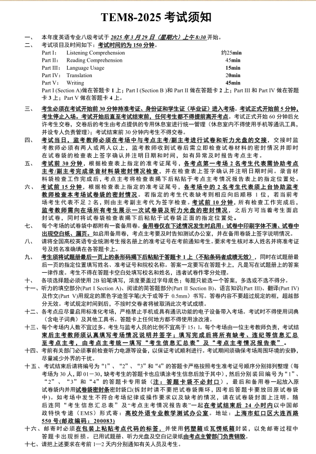 2025年全国英语专业八级统测考试将于2025年3月29日(周六)上午举行,考试地点在beat365亚洲体育官方网站番禺校区教学大楼(N)。请已报名参加考试的考生以班级为单位按时领取准考证。往届学生可委托领取,逾期不候。