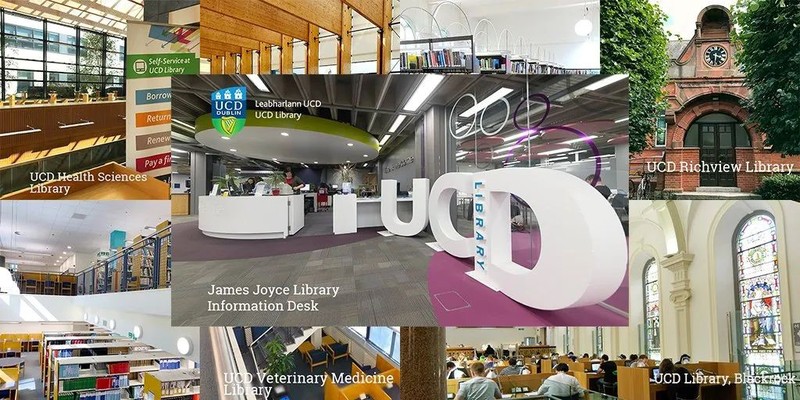 校内共设有五座图书馆,为学生提供丰富的学术资源及学习空间,包括:全爱尔兰最大的综合性图书馆、最大的商科类别图书馆、爱尔兰唯一的兽医学图书馆以及建筑、景观设计及城市规划图书馆。