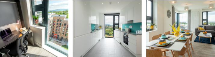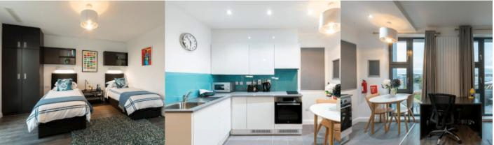 校内学生公寓距离教学楼、学生中心等步行距离可达。公寓区内为学生提供洗衣房、娱乐空间、超市、餐饮等,并且住宿团队提供全天候支持服务以及为学生组织文娱活动,为学生提供舒适的体验。
