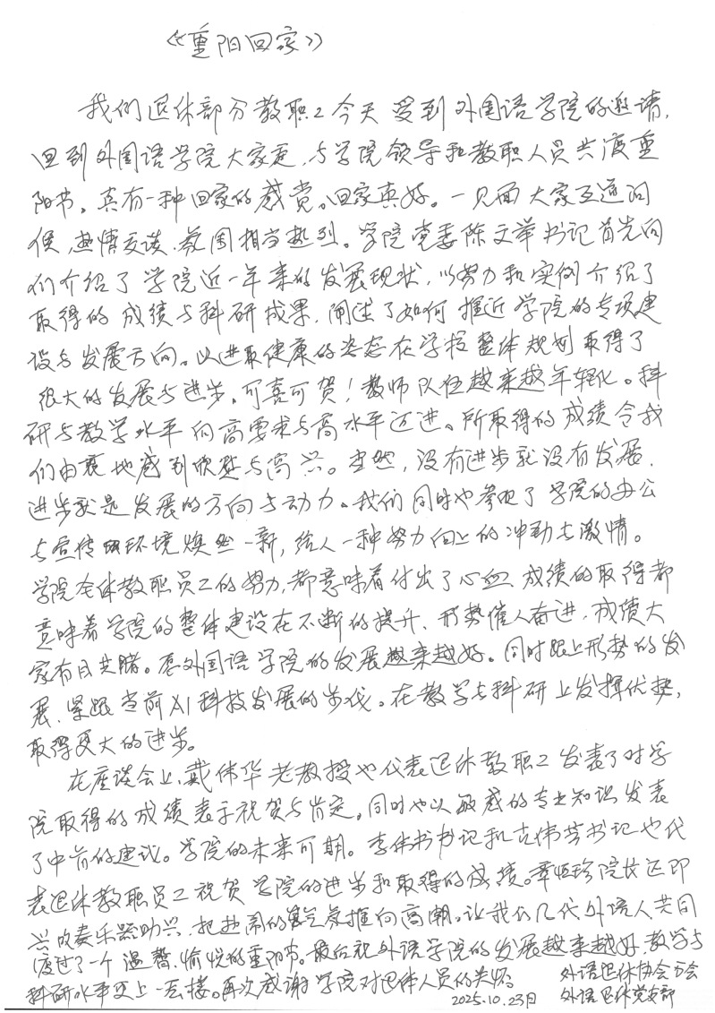 退休教师尹国庆还以《重阳回家》为题,亲笔记录了此次慰问活动,表达了离退休教工对学院发展的关心。